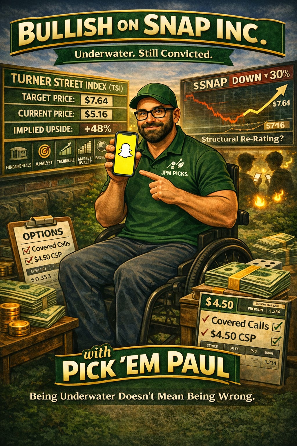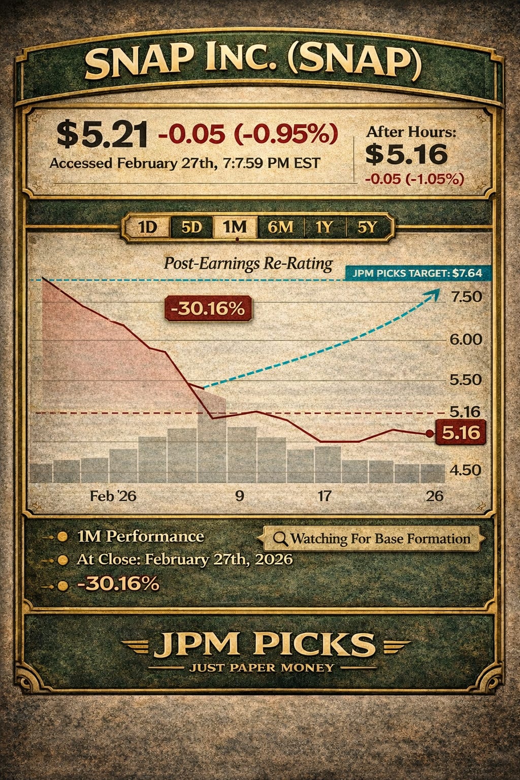 After re-running $SNAP through the TSI with post-earnings data: JPM Picks Target Price: $7.64. Current Price: $5.16. Implied Upside: +48%.