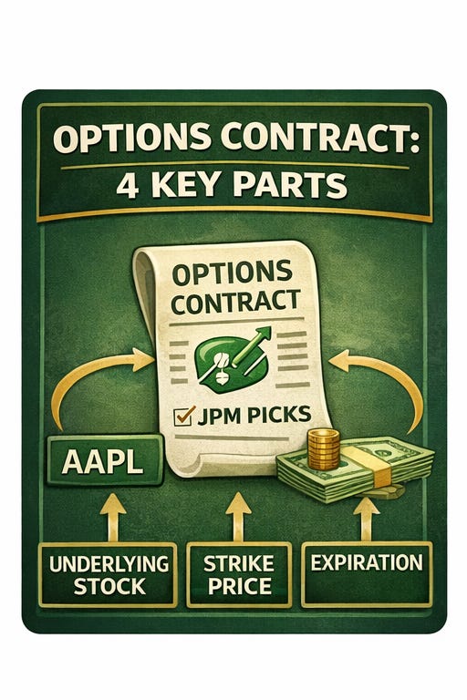 An option is just a contract, and every contract has the same four pieces: