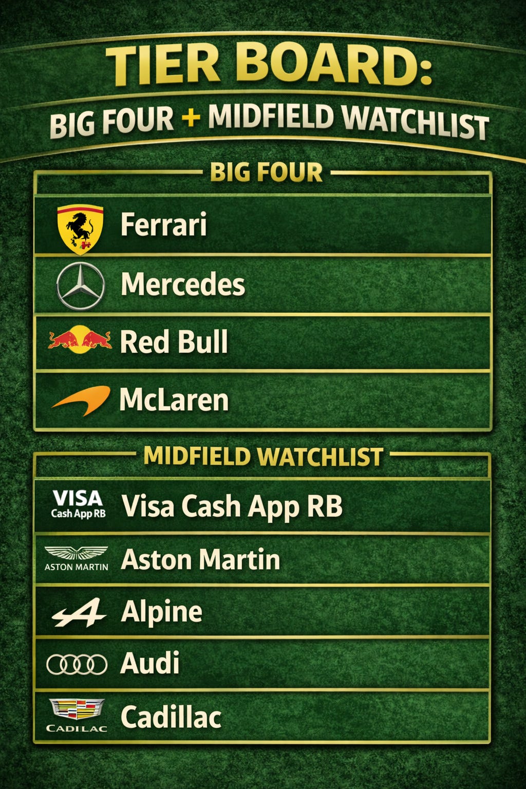 The hedge, because this is not baseball: if Ferrari hits another 2022-style implosion by June, I reserve the right to acknowledge that Vasseur or no Vasseur, sometimes the Scuderia just does Scuderia things. I am aware of the risk I am taking on with this pick. That awareness is the whole point.